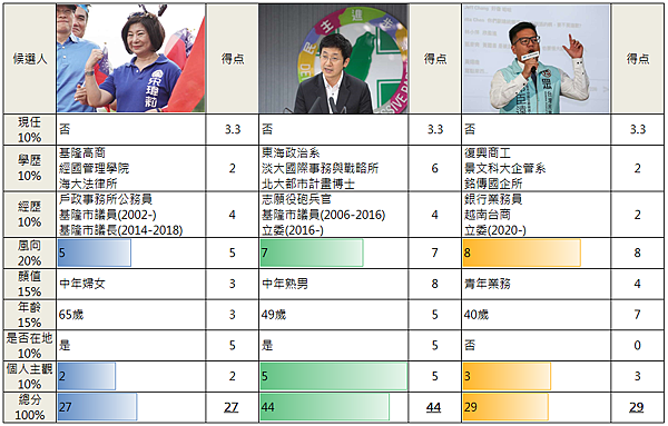 基隆在經過林右昌八年的執政之後,能否成功交棒讓民進黨在台灣頭的執政能夠延續?亦或國民黨能夠成功收復舊土?本屆選舉基隆、桃園、新竹的情況類似,都是傳統上藍大綠小的地方,經歷民進黨市長八年的經營要拚交棒,板塊是否發爭位移,是眾所關注的觀察重點,也因此筆者認為基桃竹和中彰雲是本屆兩大激戰重點區域,民進黨在基隆立委蔡適應是挑戰接棒的不二人選,而國民黨方面筆者認為上屆初選烏龍落敗的前議長宋瑋莉出線機會較高,加上民眾黨有表態的立委邱臣遠,是本篇分析的三位主要候選人。
